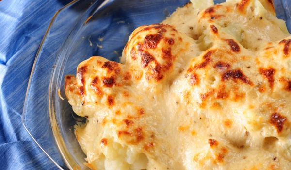 Загрейте предварително фурната на 220 градуса. Почистете карфиола и го разделете на розички, след което го пуснете в за 10 минути във вряща вода. Отцедете го и го оставете настрана. Почистете лука и г...