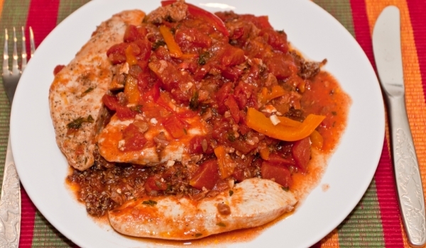 В средно голяма тенджера запържете пилешкото в зехтина и чесъна. Подправете със сол и черен пипер и добавете всички останали продукти. Захлупете тенджерата и гответе на умерен котлон за около 40 мину...