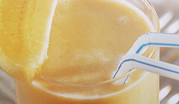 Разбийте портокаловия сок и киселото мляко в блендер или кухненски робот. Добавете едно по едно яйцата и замразените банани. Разпределете смутито в чаши и декорирайте с парченце банан. Добавете слам...
