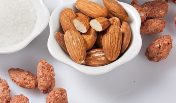 Бадемите се заливат с врялата вода и се оставят за 1 минута. Изваждат се с решетъна лъжица и се измиват със студена вода. После се обелват. Мазнините се загряват в тиган. Добавят се обелените бадеми...