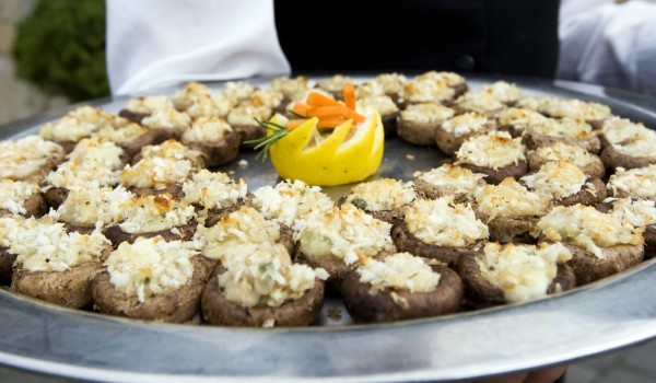 Изчистете и измийте гъбите. Отделете пънчетата. Целите шапки задушете в маслото, извадете и подредете в чиния за сервиране. Нарязаните на ситно пънчета леко задушете в маслото, смесете с картофеното...