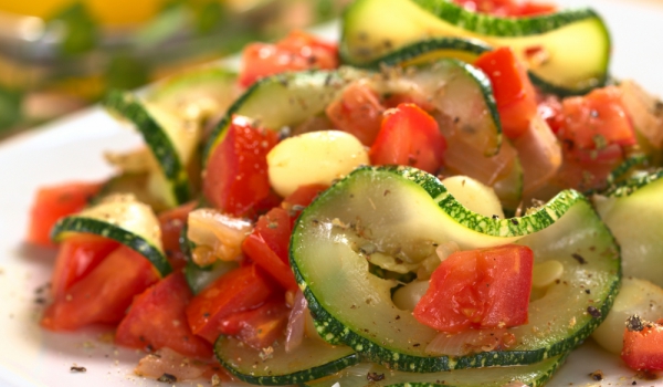Нарежете тиквичките на ленти по дължина с помощта на белачка за зеленчуци. запечете лентичките в сух тиган на умерен огън - колкото само да се затоплят. Добавете в тигана доматите и босилека. Раздру...