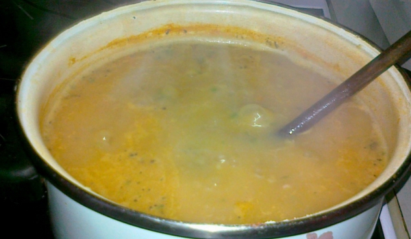 Запържва се морковът и лукът, след това се прави запръжка на брашното и червеният пипер. Добавят се картофите, които са нарязани на едро и се добавя вода или бульона от вареното телешко. Като заври...