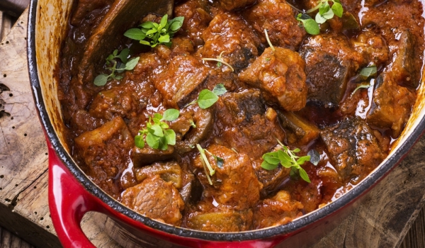 Телешкото се измива и се нарязва на не много едри парчета. Прави се марината, като се смесва ситно нарязаният лук, ситно нарязаният чесън, виното, солта, оцетът, нишестето и половината от олиото. Ост...