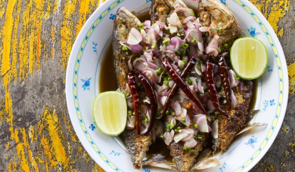 Киселите краставички се нарязват на кръгчета и се слагат в тавичка. Добавят се маслините, дафиновите листа, черният пипер, олиото и 1 ч.ч. вода и се разбърква. Измитата и посолена риба се нарежда в...