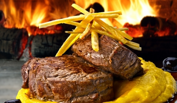 Пържолите се нарязват на кубчета и се запържват в тиган със соев сос. Картофите се сваряват след което се обелват и се намачкват на пюре. Сервира се в чиния като пюрето се слага като канапе с дупка по...