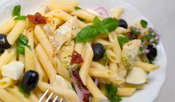 Сварете пастата според указанията на опаковката, след което я изплакнете под студена вода. Добавете към нея маслините, нарязаните на кубчета сирена, нарязания на тънки полумесеци лук и добре отцедени...