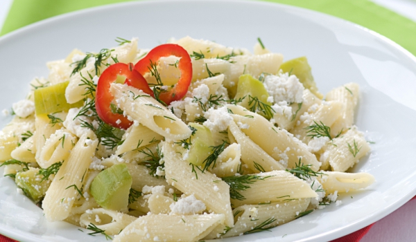 Пастата се сварява в подсолена вода. Междувременно се приготвят зеленчуците. Тиквичките се нарязват, чесънът се наситнява. Запържват се на силен огън за няколко минути. Изсипват се в купа. Доматът и...