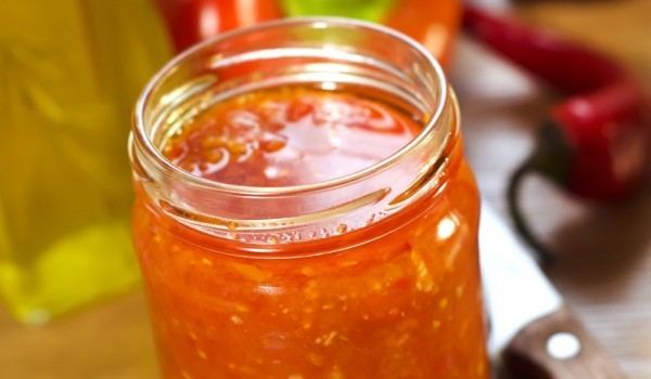 Почистете пиперките от семките и дръжките и ги нарежете на парчета. Доматите са почистват от зеленото около дръжката и също се нарязват на парчета. Продуктите се смилат в машинка за мелене на месо, з...