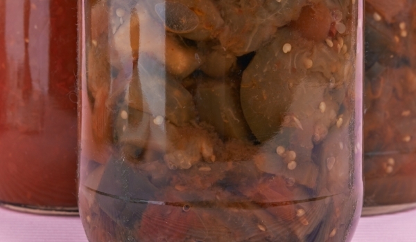 Изпечете чушките и патладжаните, задушете ги за кратко в найлонов плик, след което ги обелете. Накъсайте ги - "дърпайте" по дължина и леко ги посолете. Смесете оцета, черен пипер и малко сол и кипнет...