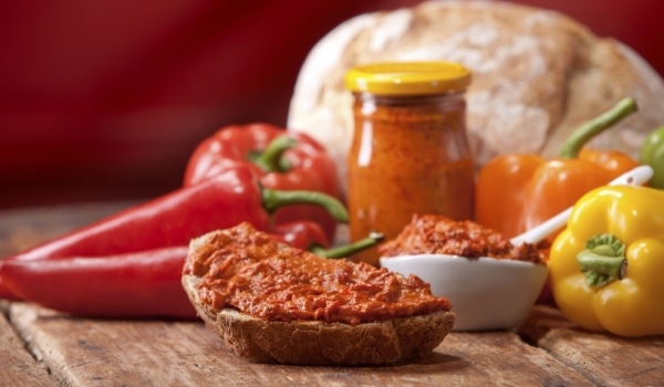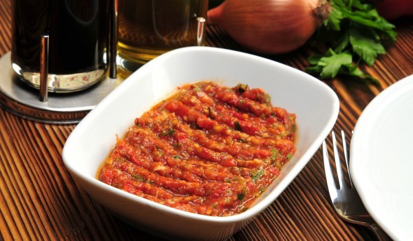 Изпечете чушките и патладжаните и ги обелете. Смелете ги едро през месомелачка и ги смесете с доматеното пюре. Може да използвате готово или да пасирате домати и да ги сварите, докато се сгъстят. Сло...