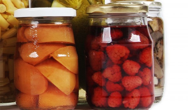 Сварете водата заедно с подправките и подсладителя. След това отстранете канелата. Плодовете се почистват, нарязват, пълнят се в буркани и се заливат с горещи сироп. Затварят се с капачки и се стери...