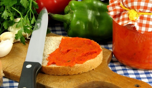 Изпечете пиперките, обелете ги и ги почистете от дръжките и семките. Патладжаните също опечете и обелете. Смелете през машинка за месо пиперките и патладжаните. Сложете нарязаните червени домати да с...