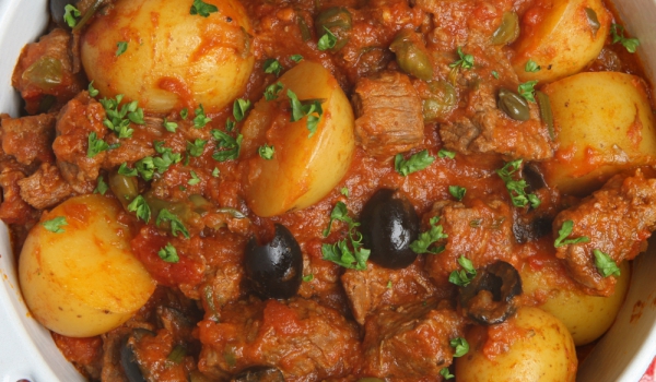 Месото се реже на малки парченца, залива се с вряла вода, така че да го покрие, и се вари до омекване. Картофите и лукът се режат на половинки, червените чушки се режат на четири части, като се отстр...