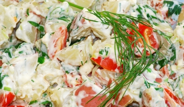 Добре измитите картофи се сваряват в подсолена вода. Обелват се, докато са горещи и се нарязват на кубчета. Смесват се със ситно нарязаната маруля, доматите и краставицата, нарязани на тънки резени....