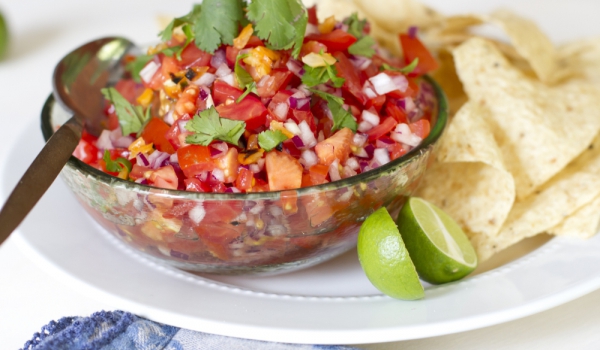Изстискайте сока на лайма в малка купа и прибавете захар, сол и черен пипер. Изчакайте, докато захарта и солта попият сока и разбъркайте добре. Прибавете лука, доматите, краставицата и лютата чушка и...