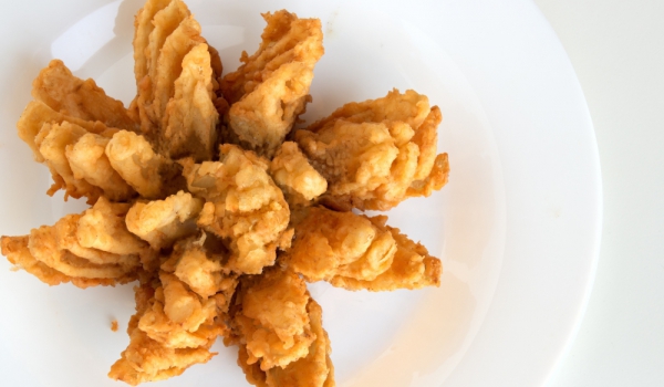 Внимателно почистете лука. Направете няколко кръстовидни разрези, като внимавате да не срежете напълно лука. Леко разширете разрезите, така че лукът да заприлича на чашката на цвете. Потопете го за 10...