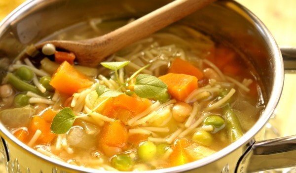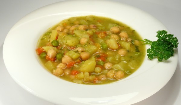Почистете картофите и морковите и ги нарежете ситно. Заедно с почистения зелен фасул, граха, нахута ги сипете в тенджера под налягане и долейте достатъчно топла вода. Прибавете олио и затворете тенд...