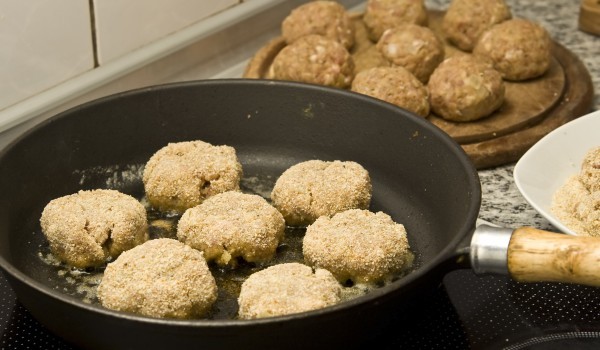 Към каймата се добавят ситно нарязаният лук, соевият сос, оризовото вино, солта и жълтъците. Хубаво се омесва и се правят малки топчета, които се овалват в нишесте. Топчетата се пържат в нагорещено ра...