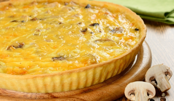 Брашното се смесва с маслото до образуване на трохи. Добавят се 2 супени лъжици вода и се замесва гъсто тесто. Разточва се и се слага в четири кръгли тавички. Върху тестото се слага намазана с олио х...