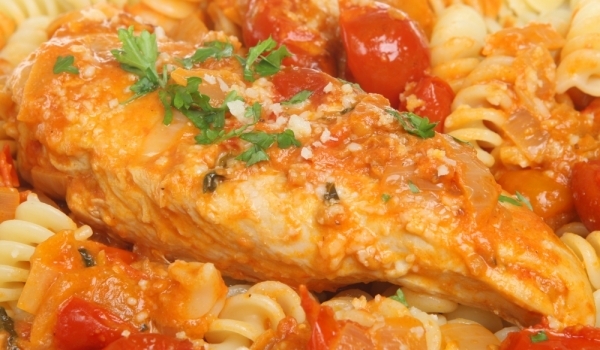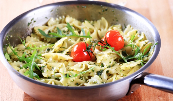 Пастата се вари според указанията на опаковката и отцежда се. Прибавят се приготвените продукти, овкусяват се със сол и черен пипер. За заливката: оцетът и зехтинът, солта, черният пипер и пасираният...