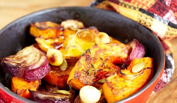 Тиквата се обелва и се реже на парченца. Картофите се обелват и се режат на резени. Лукът се реже на шайби. Чесънът се обелва и се реже на половинки. Чушката се реже на ивици. В тиган се излива олиот...