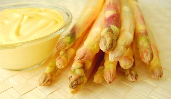 Почистете аспержите и ги сложете да се посварят за около 6 мин. в гореща вода и млякото. Отцедете ги и ги сложете в леко намазнена тава. Разбъркайте заедно натрошеното сирене, изварата и накълцания ди...