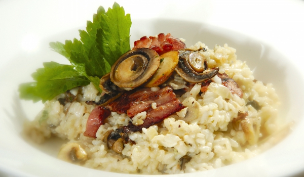 Загрейте олиото в тиган и изпържете ситно нарязания бекон, докато стане хрупкав. Прибавете нарязаните чесън и лук и ги запържете до омекване. Прибавете ориза и разбъркайте. Залейте с бульона и оставе...
