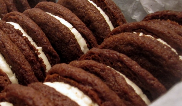Загрейте фурната на 180 градуса и застелете тава с хартия за печене. Смесете заедно брашно, какао на прах, содата, бакпулвера, солта и захарта. Разбийте мекото масло със захарта на гладък крем и доба...