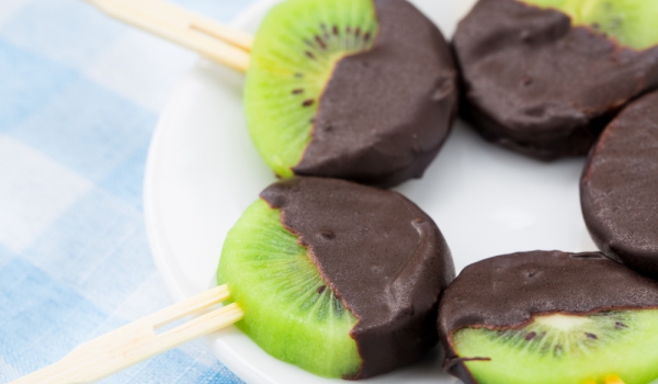 Кивито се обелва и се нарязва на половинки. Във всяка половинка се пъхва дървена клечка за сладолед. Шоколадът се начупва и се разтопява на водна баня. Всяка половинка киви се топва в шоколад, за да...