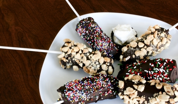 за рецептата са ви необходими 8 бр. пръчици за сладолед. Бананите се обелват, разрязват се на две през средата и във всяка половинка се пъха една пръчица за сладолед. Върху тава се постила хартия за...