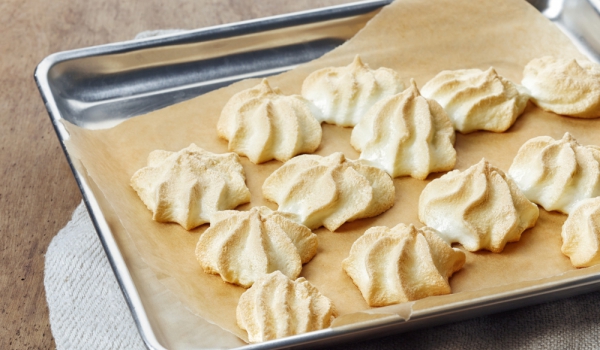 Кората на лимона се настъргва. Белтъците се бият на сняг, добавя се захарта и при постоянно разбъркване с телче сместа се нагрява до 45 градуса. Добавя се пудрата захар, ванилията и кората от лимона....