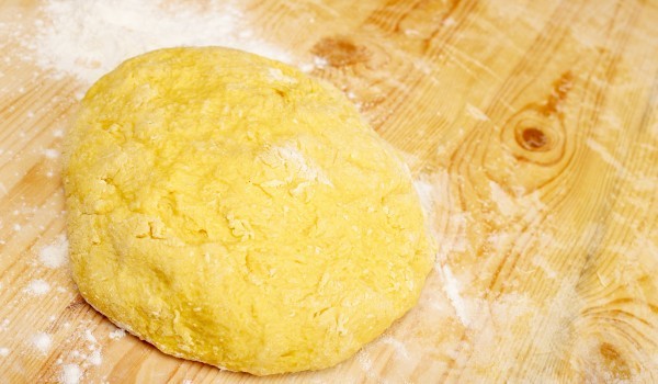 Брашното и солта се пресяват. Използва се блендер, за да се разбие и втрие маслото, докато сместа заприлича на трохи. Добавят се водата и жълтъците. Меси се бързо, за да се получи твърдо тесто. Трохи...