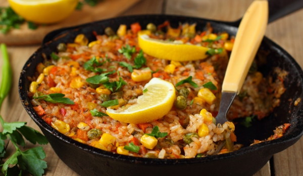Залейте шафрана с 4 с.л. от горещия зеленчуков бульон. Оставете го да престои така 5 минути. Междувременно загрейте зехтина в тиган, подходящ за приготвяне на паеля. Сложете вътре нарязания лук и счук...