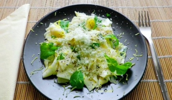 Пригответе тесто от яйцата, солта и брашното. Докато водата за варене се топли, поставете тестото в хладилника. Нарежете тестото на лентички и във вряща и солена вода сварете лентичките за около 2 мин...