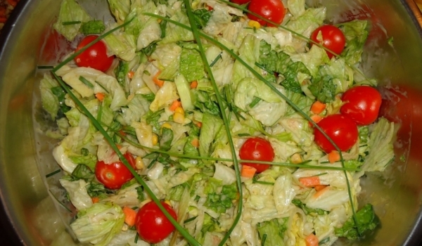 В подходяща чиния за сервиране се слагат марулите, а върху тях се слагат доматите, зеленият фасул и маслините. Сос за салатата: Чесънът, оцетът и зехтинът се разбиват. Смесват се със солта и черният...