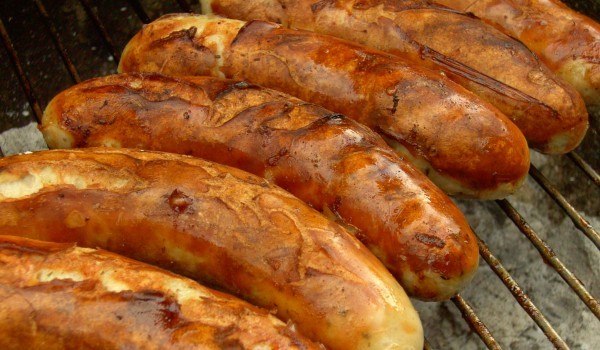 Наденицата се нацепва напряко и се изпича на намазнена с олио скара. Картофите се сваряват, обелват и се намачкват с ръчен пасатор, като се добавя маслото, млякото, солта, ситно настърганата целина и...