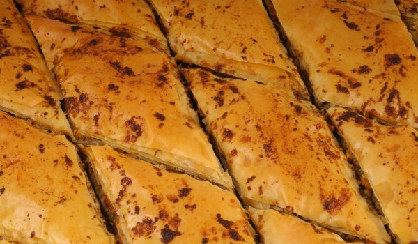 Предварително се приготвя смес от счуканите орехи, бадеми и канела. Тавата за печене се намазва с мазнина. На дъното се поставя една кора, намазва се с масло и върху нея се поставя следващата кора....
