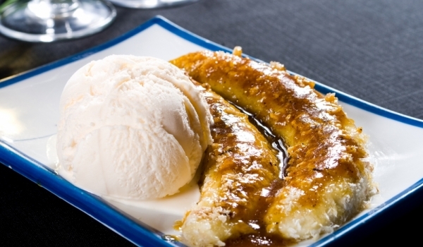 Разрежете бананите надълго, после и напряко. Маслото се стапя в дълбок тиган на силен котлон докато започне да прави пяна. Поставете бананите с нарязаната страна надолу, и ги задушете леко (соте), ка...