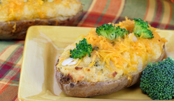 Измийте картофите, подсушете с кухненска хартия и ги надупчете на няколко места. Подредете ги в тава с хартия за печене и ги печете за час на 200 градуса. За хумуса сварете и охладете нахута. Блендир...