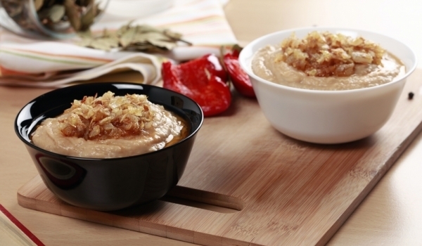 Слагаме боба да се стопли, трябва да е горещ. Счукваме чесъна и лютата чушка със сол, слагаме при горещия боб и пюрираме. Трябва да се получи гъсто пюре с парченца. След това добавете 2 - 3 с. л. тах...