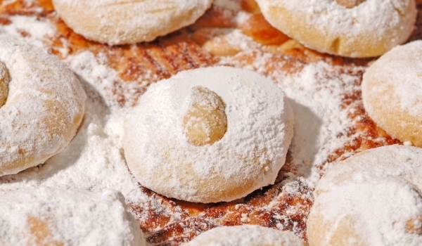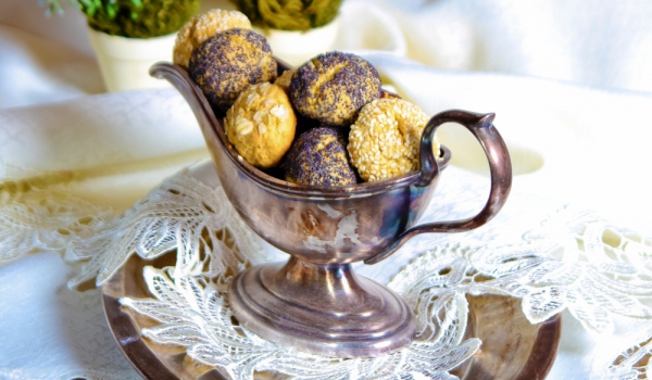 Разтопяваме маслото на стайна температура и го смесваме с брашното. Към сместа, с разбъркване, прибавяме един по едни жълтъците и замесваме тесто. Правим топчета с големина на орех и ги оставяме да п...