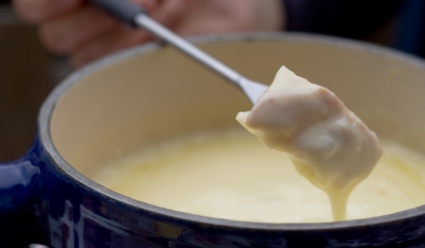 Натрийте съда за фондю с чесън. Стопете маслото, добавете брашното и разбъркайте, като запържите за 2-3 минути. Бавно долейте млякото при непрекъснато бъркане. Добавете и сиренето и бъркайте леко на...