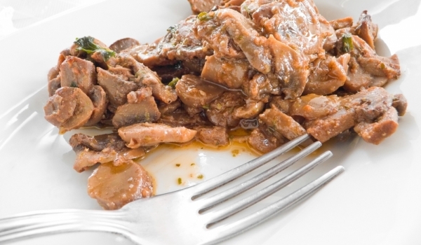 Почистете гъбите с четчица, забършете ги с кърпа, нарежете ги и ги сложете да се сварят в лимоновия сок и бульона за около 2 минути, докато омекнат. Извадете ги с помощта на решетъчна лъжица и ги сло...
