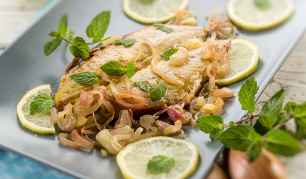 Нарежете на тънки кръгчета лука, моркова и ги подредете в намазнена тавичка заедно с рибата. Полейте със зехтин, лимоновия сок и поръсете подправки на вкус. Залейте рибата с вино и сложете да се пече...