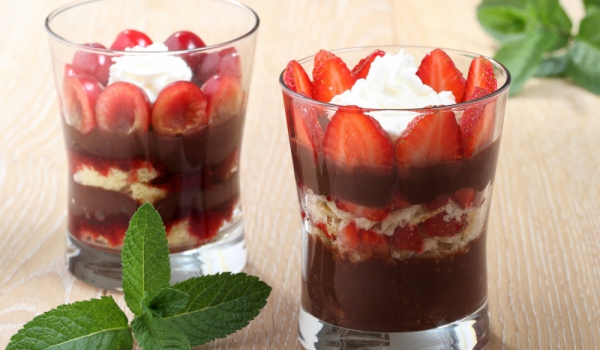 Ягодите се нарязват на четвъртинки. Сметаната се разбива с пудрата захар, добавя се какаото на прах и ванилията. Ягодите се слагат в купички, покриват се с крема, отгоре се слагат малини и се поръсва...