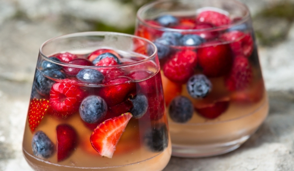 Половината вино се кипва, сваля се от огъня, добавя се захарта и предварително накиснатият и разтворен на водна баня желатин. Всичко се смесва. Боровинките и нарязаните на четвъртинки ягоди се разпре...