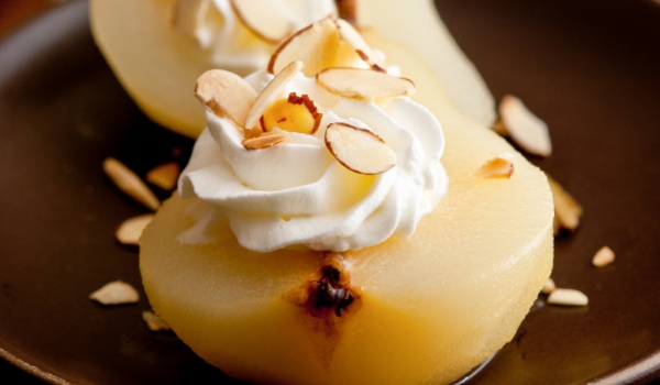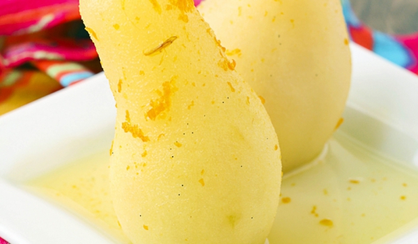Крушите се обелват, без да се отстраняват дръжките. Срязва се долната част, за да стоят стабилно. Изцежда се сокът от лимона, като 1 супена лъжица се запазва за соса, останалата част се смесва с 2 чае...