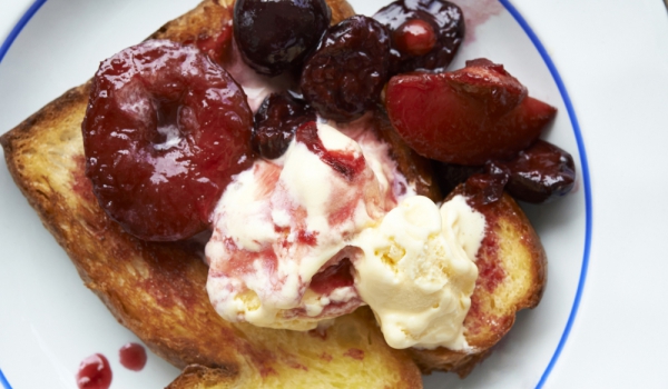 Сливите се разрязват на половинки, отстраняват се костилките и плодовете се слагат в хладилник. Малините се пасират, сметаната се разбива със захар, добавят се малините и се смесват. Всичко се разбър...