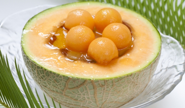 Захарта и медът се смесват със 100 милилитра вода и се загряват до разтварянето на захарта. Оставят се да се охладят. Пъпешът се разрязва на две, отстраняват се семките. С лъжица се изваждат 20 топче...